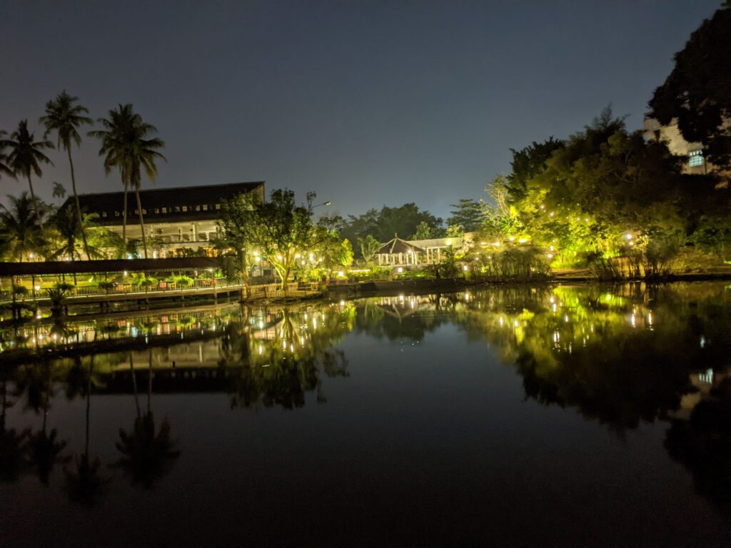 Tempat ini adalah salah satu restoran favorite ku karena terdapat kolam renang umum, kolam ikan, taman, restaurant yang indah dan makanan nya juga sangat nikmat dan berkualitas, aku senang mengunjungi tempat ini karena romantis. Kolam ikan yang luas, desain outdoor yang rapi dan tertata serta lampu-lampu hangat yang menambah keindahan. Aku menyukai restoran yang memilih untuk memilih furniture nuansa kayu karena memberikan kesan kesederhanaan dan natural