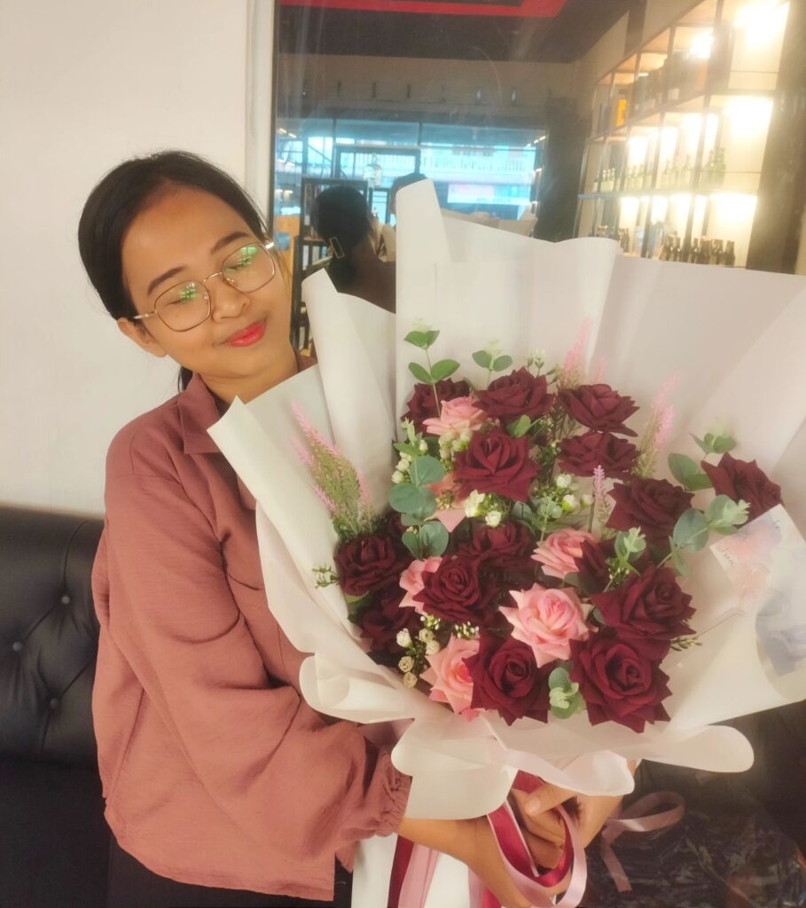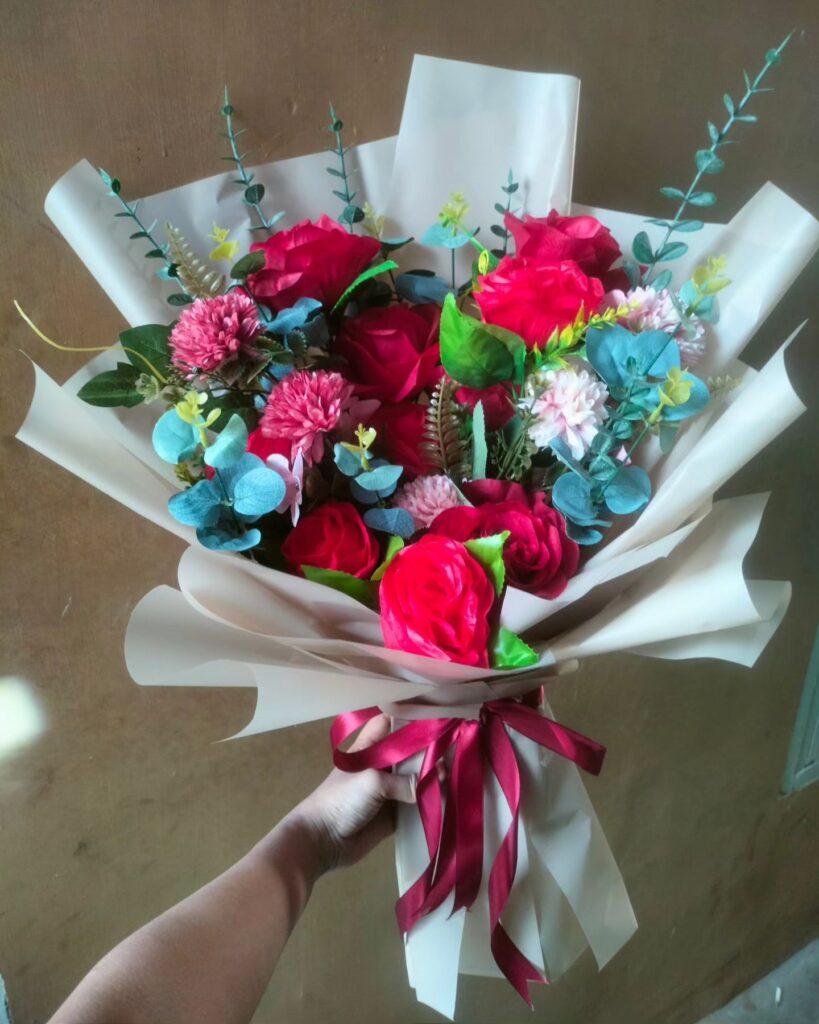 I often get orders for roses on Valentine’s Day and anniversary celebrations, so romantic for couples. And then Chrysanthemums are often associated with symbols of resilience and happiness, although this flower often blooms in autumn, chrysanthemums are known for their resilience and ability to remain beautiful despite unfavorable weather, that’s why I often collect chrysanthemums from florists besides being affordable, they also have a variety of colors.