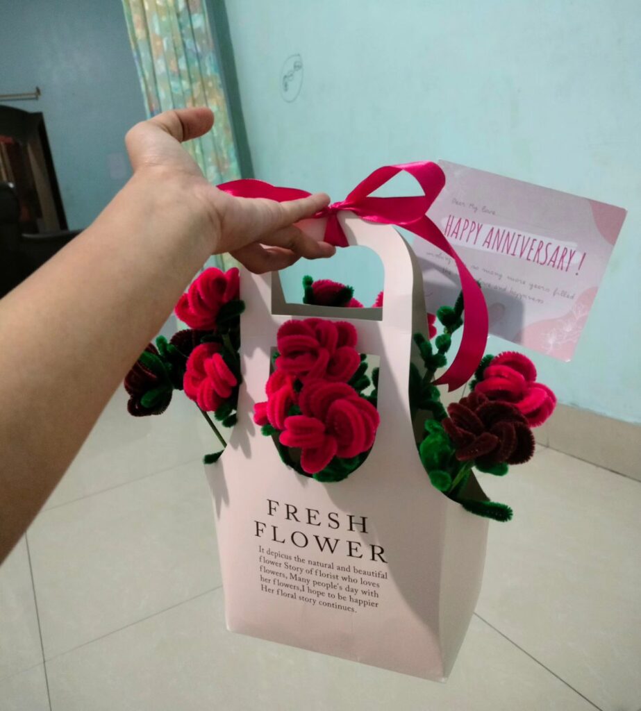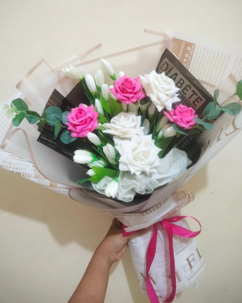 Creativity is also needed in making a flower bouquet or other handicrafts, using materials that are easily recycled is a wise choice as our concern so as not to produce a lot of waste. for example, replacing fabric flower ribbons with hemp rope derived from wood fibers or flower base paper using old newspapers or magazines and can also use colored paper, simple but memorable.