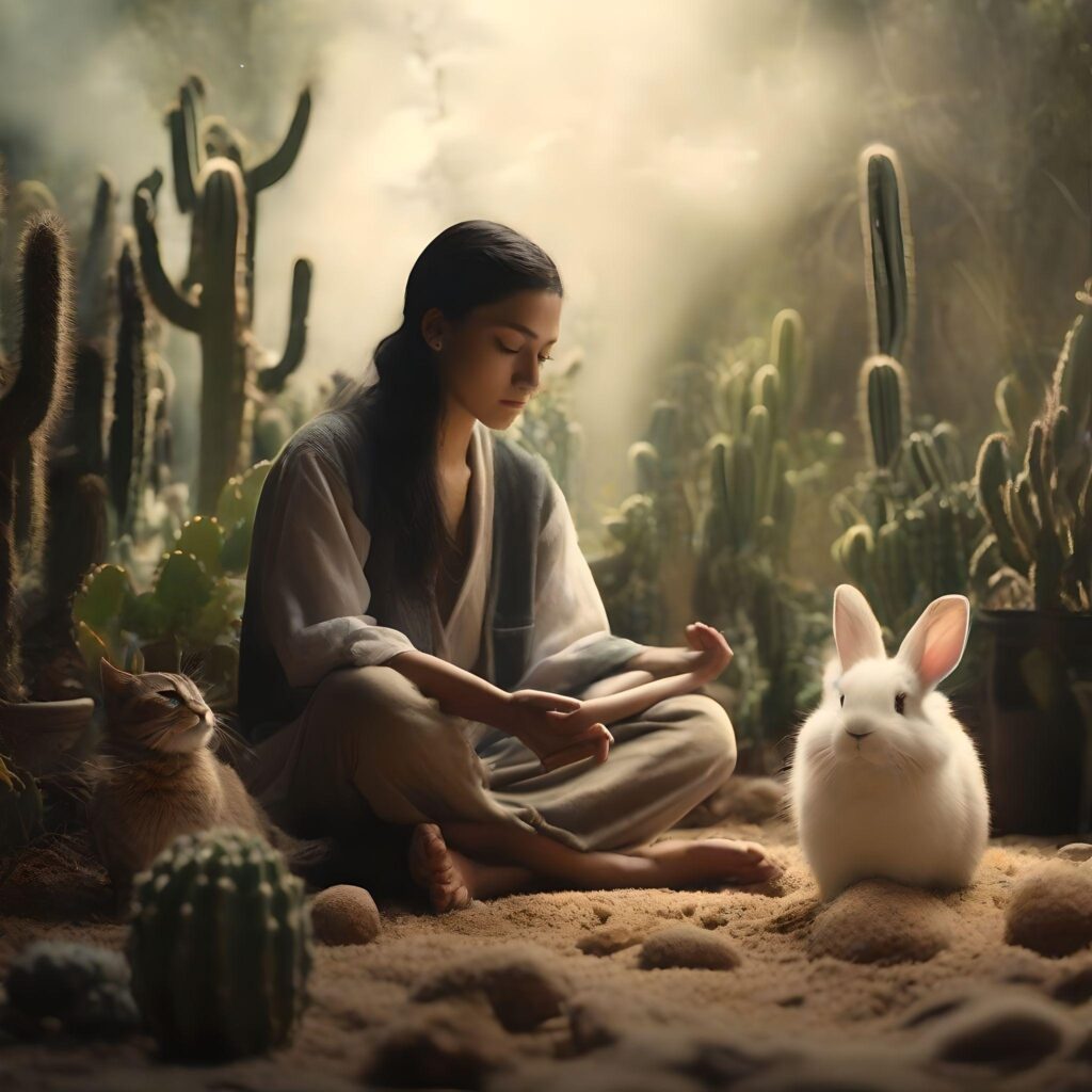 It is important for her to try to deepen the connection with herself and the universe, trying to explore meditation inspired by Laotzi’s philosophy, allowing Luna to find inner peace amidst the hustle and bustle of modern life, meditation invites us to let go of attachment to the ego and harmonize with the natural rhythm of the universe. With a regular meditation practice to bring peace, increase self-awareness, and live more in tune with time, she learned to let go of her control over life and let nature flow in its own way. In her inner calm, she found true strength and serenity, under the old tree she felt true peace and lived in harmony.